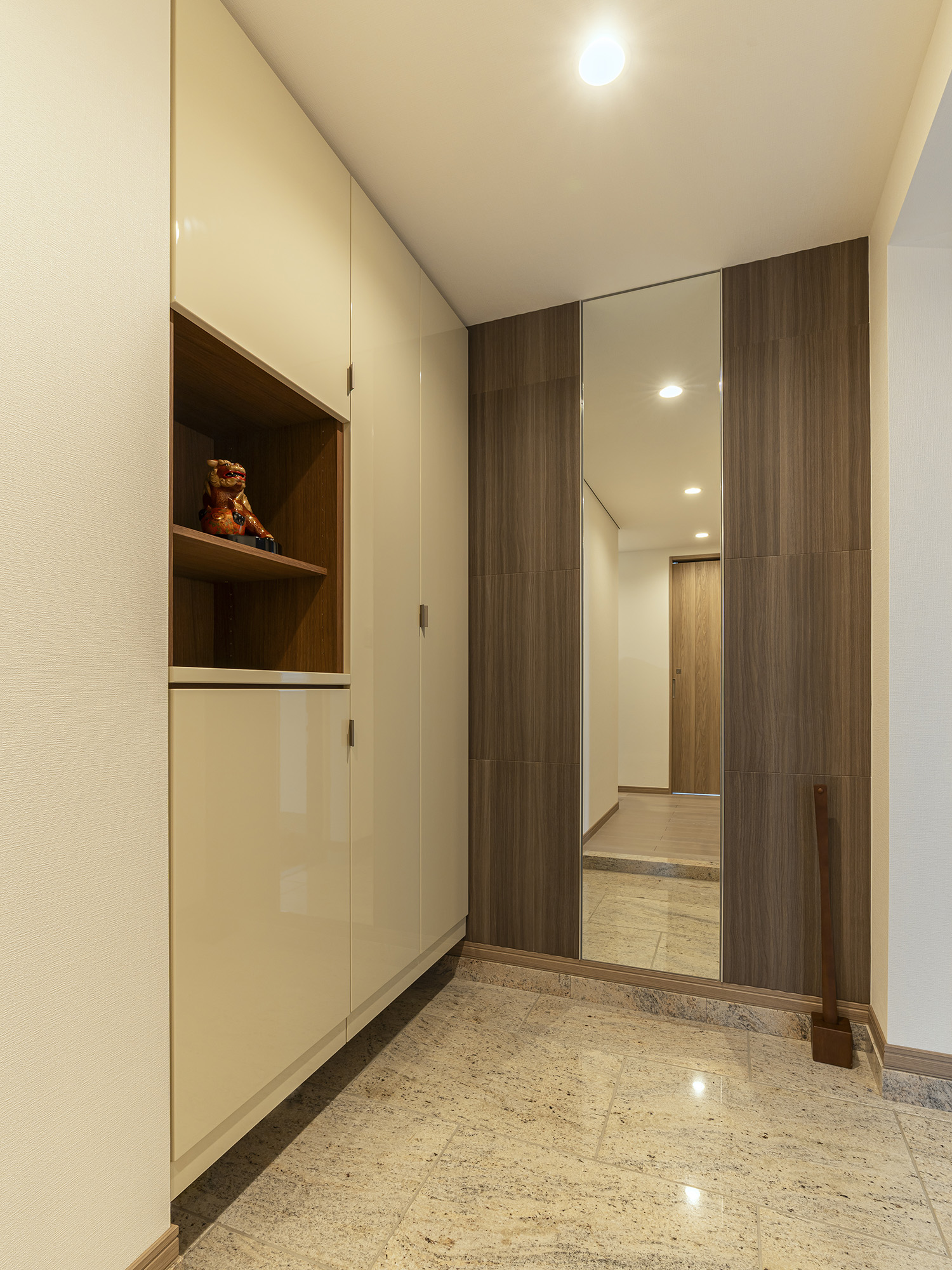 ①廊下を抜けて扉を開くと正面にある造作した大きな鏡が目に入ります。