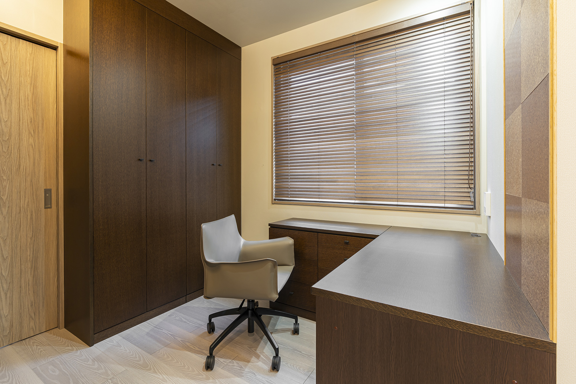 ⑪LDと一続きの書斎部分はガラッと雰囲気を変えて少し濃い色目の家具を造作しました。