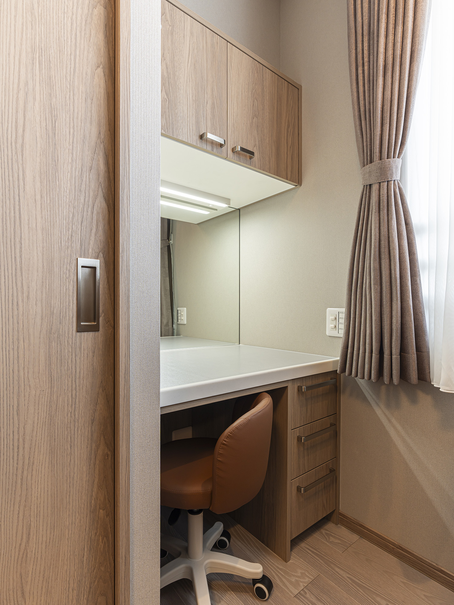 ⑦寝室収納横のドレッサーは、横の建具と同色・同柄とし寝室を統一された木目にいたしました。
